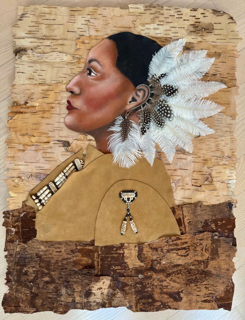 Oil on canvas, authentic bark used to make canoes, authentic feathers and beads,